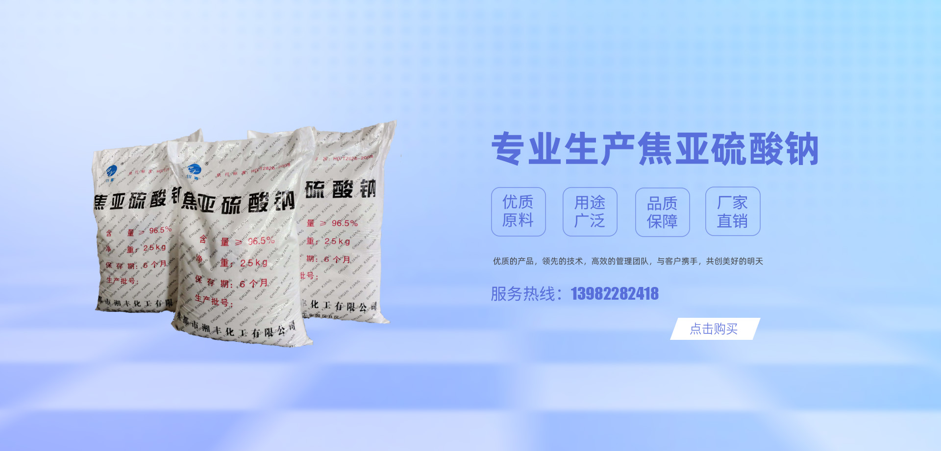 成都市湘豐化工有限公司座落在四川省成都市新津精細化工園中,占地10000多平方米,是一家有十幾年焦亞硫酸鈉生產(chǎn)經(jīng)驗的企業(yè),設(shè)計年生產(chǎn)能力2萬噸。 焦亞硫酸鈉又稱二硫五氧酸鈉,重硫氧,有著廣泛的用途:在醫(yī)藥工業(yè)中用于生產(chǎn)氯仿、苯丙砜和苯甲醛;橡膠工業(yè)用做凝固劑;印染工業(yè)用作棉布漂白后的脫氯劑、棉布煮煉劑;制革工業(yè)用于皮革處理,能使皮革柔軟,豐滿、堅韌,具有防水、抗折、耐磨等性能...